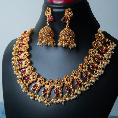Exquisite temple jewelry necklace set featuring intricate peacock motifs in antique gold finish, adorned with ruby, emerald stones and pearl clusters. Perfect for bridal wear and special occasions.