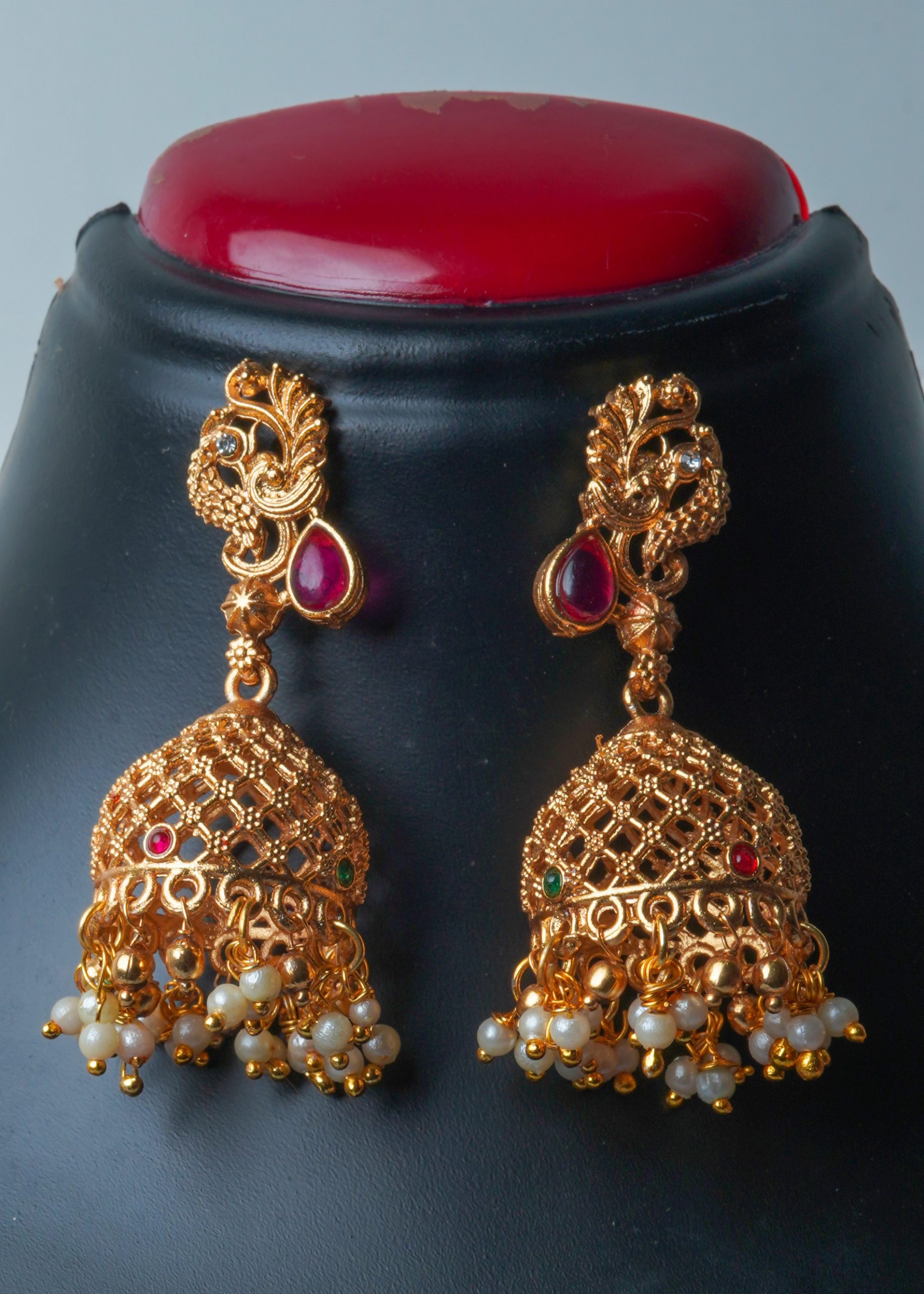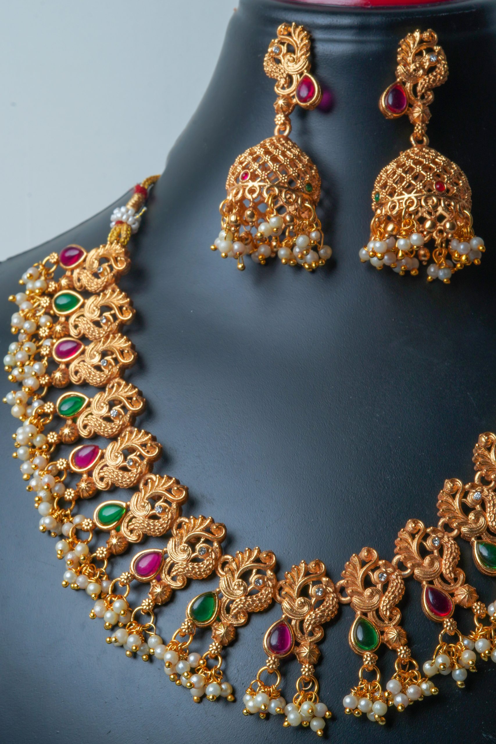 Antique Gold Peacock Design Necklace Set with Ruby, Emerald and Pearl Drops